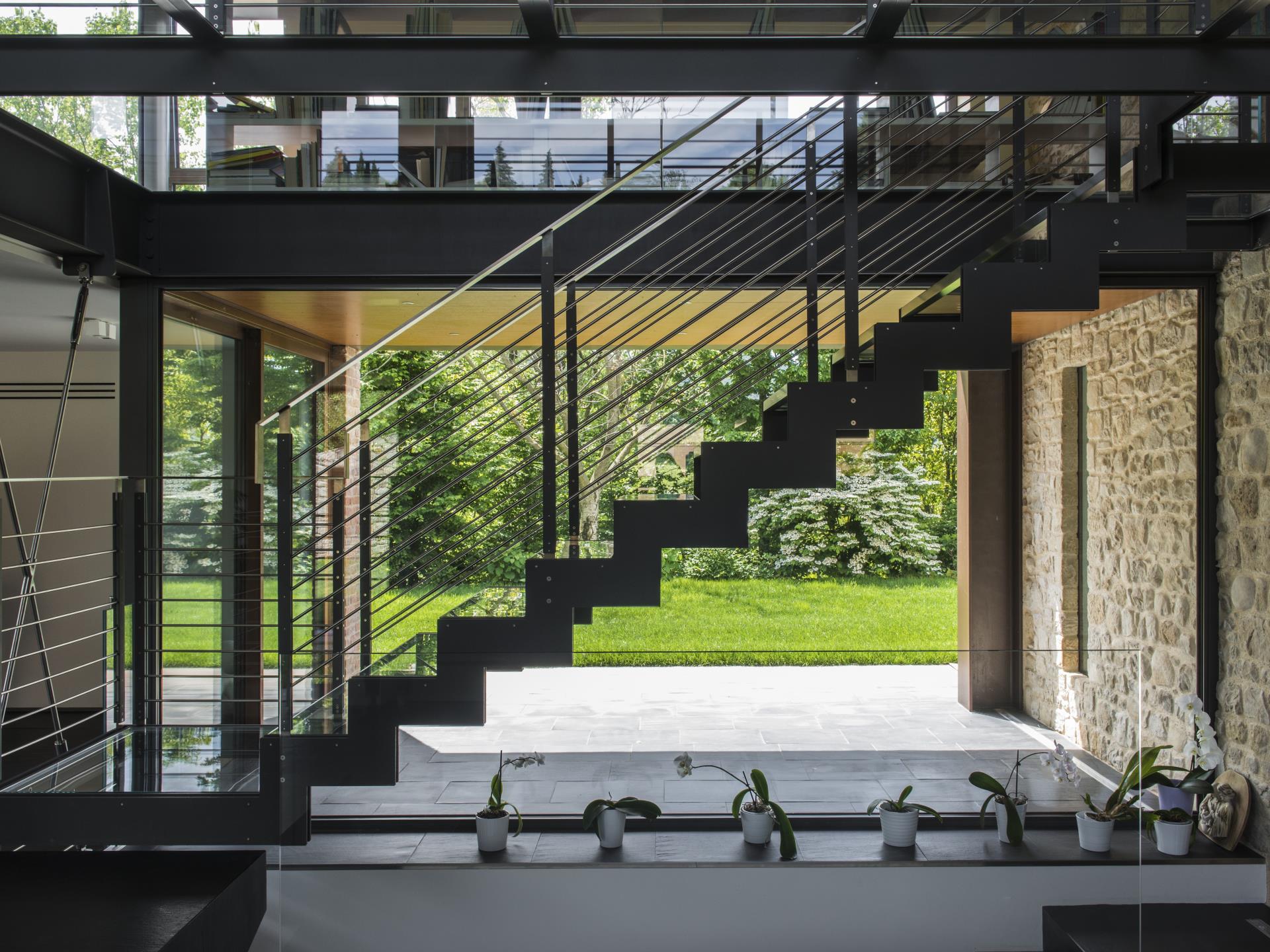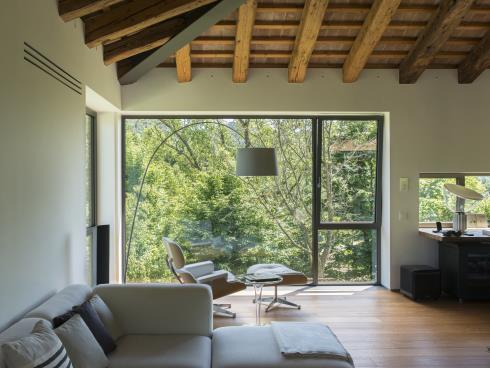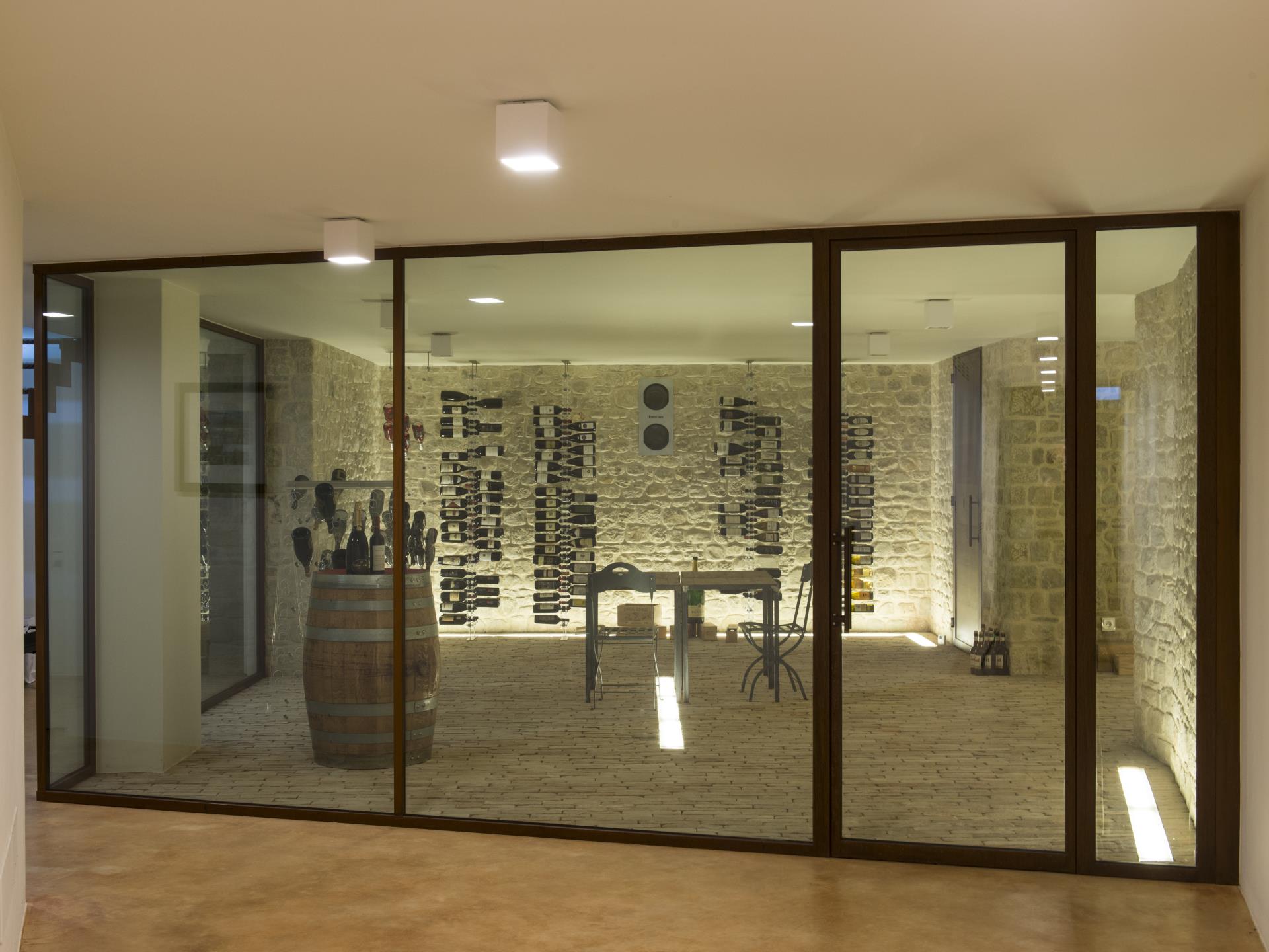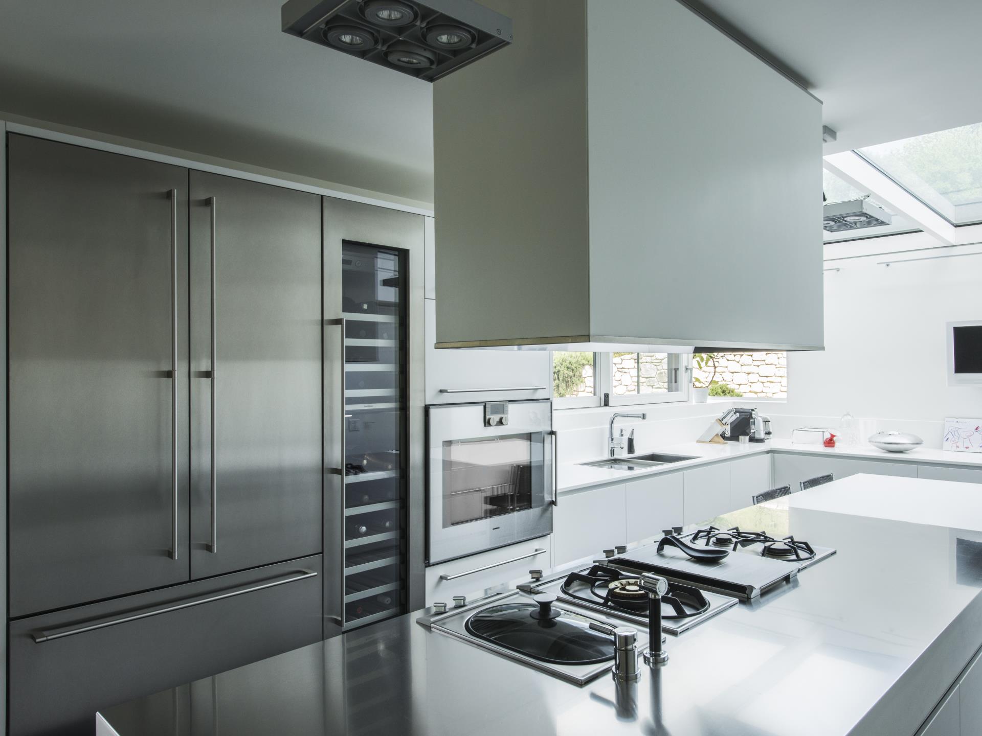 Al piano interrato, cui si accede con un sistema di scale o tramite ascensore, si trovano la lavanderia, uno spazio di connessione con il garage e la cantina: quest’ultima, realizzata a tutta luce con serramenti in acciaio corten, acquista una suggestione del tutto diversa rispetto al resto degli ambienti della casa. Il piano terreno, dominato dalla zona giorno e dalla cucina, si collega ai piani superiori mediante una scala realizzata in acciaio inox e vetro, completamente autoportante, una passerella in vetro e acciaio che conduce allo spazio living e studio ed un’altra scala in acciaio di colore bianco, posta in ideale continuità con la precedente, che porta invece al sottotetto, una suite vera e propria con area wellness, bagno e ampia cabina armadio.