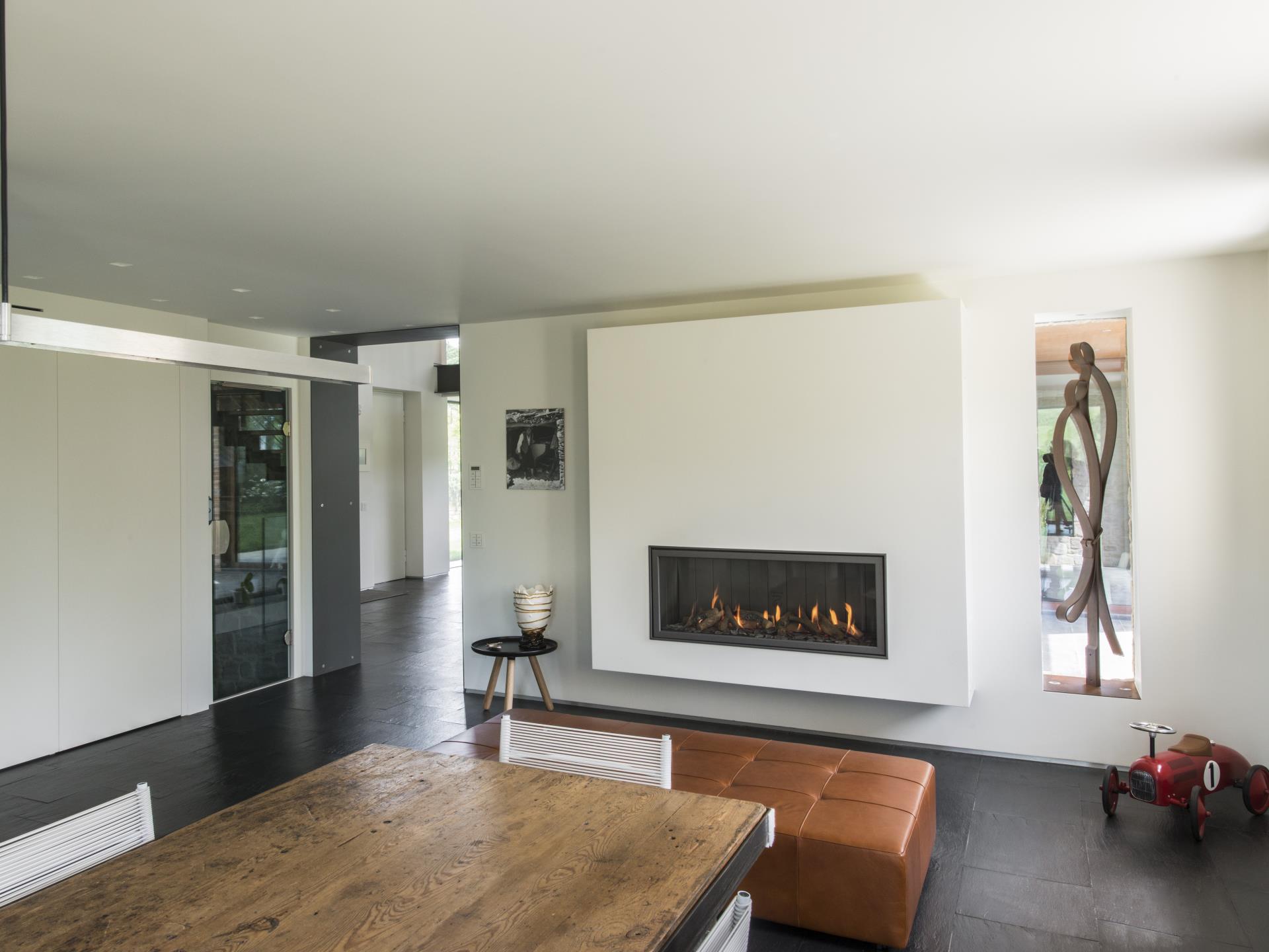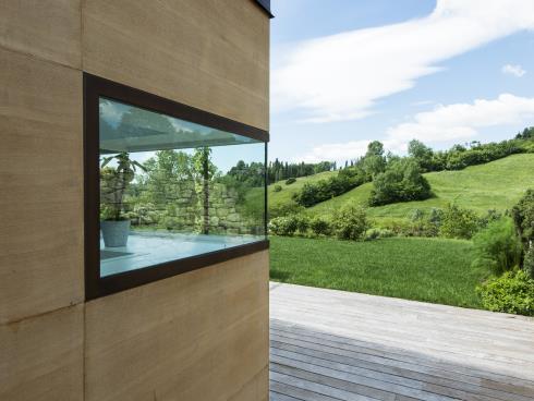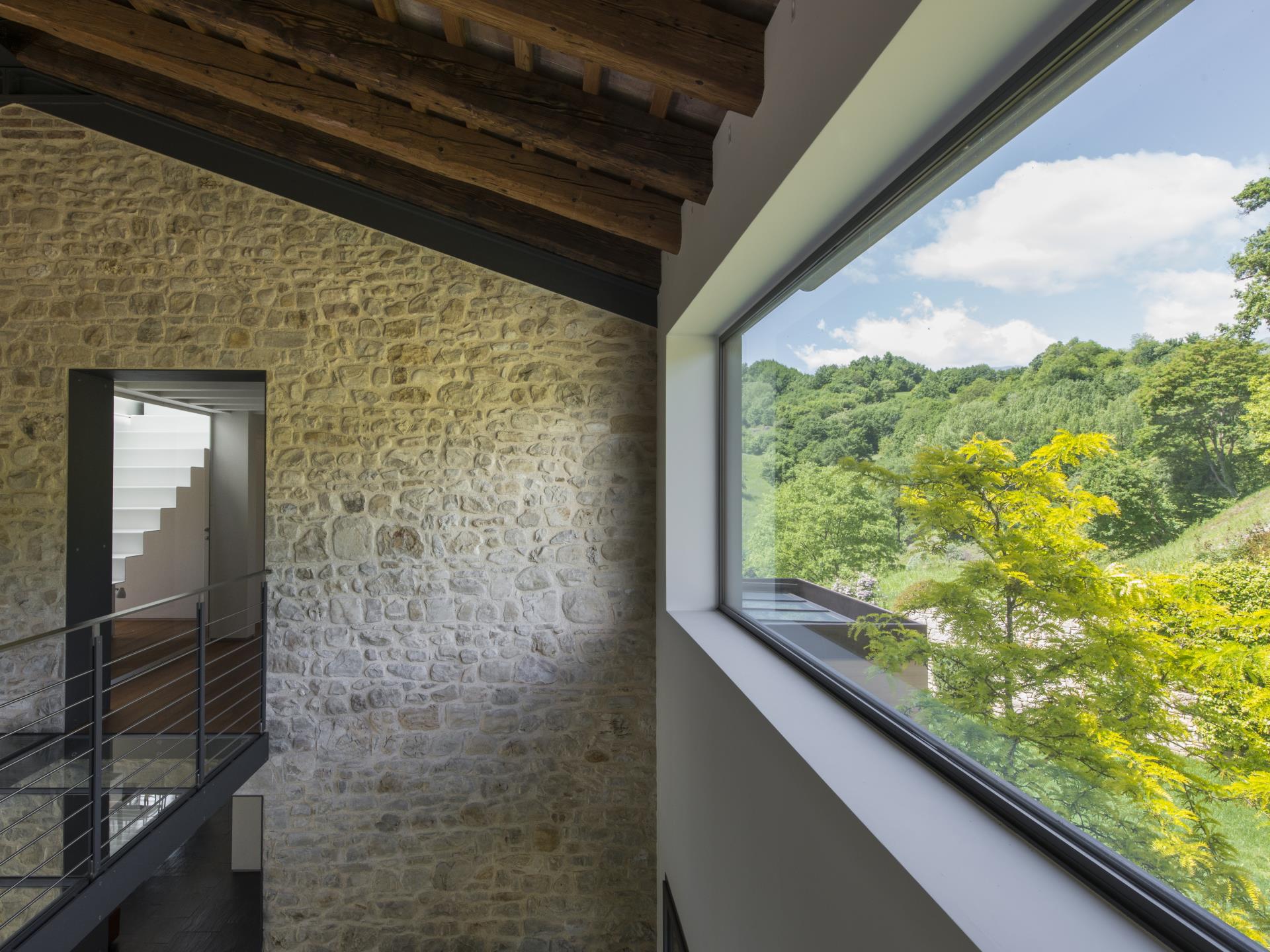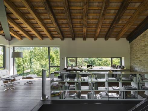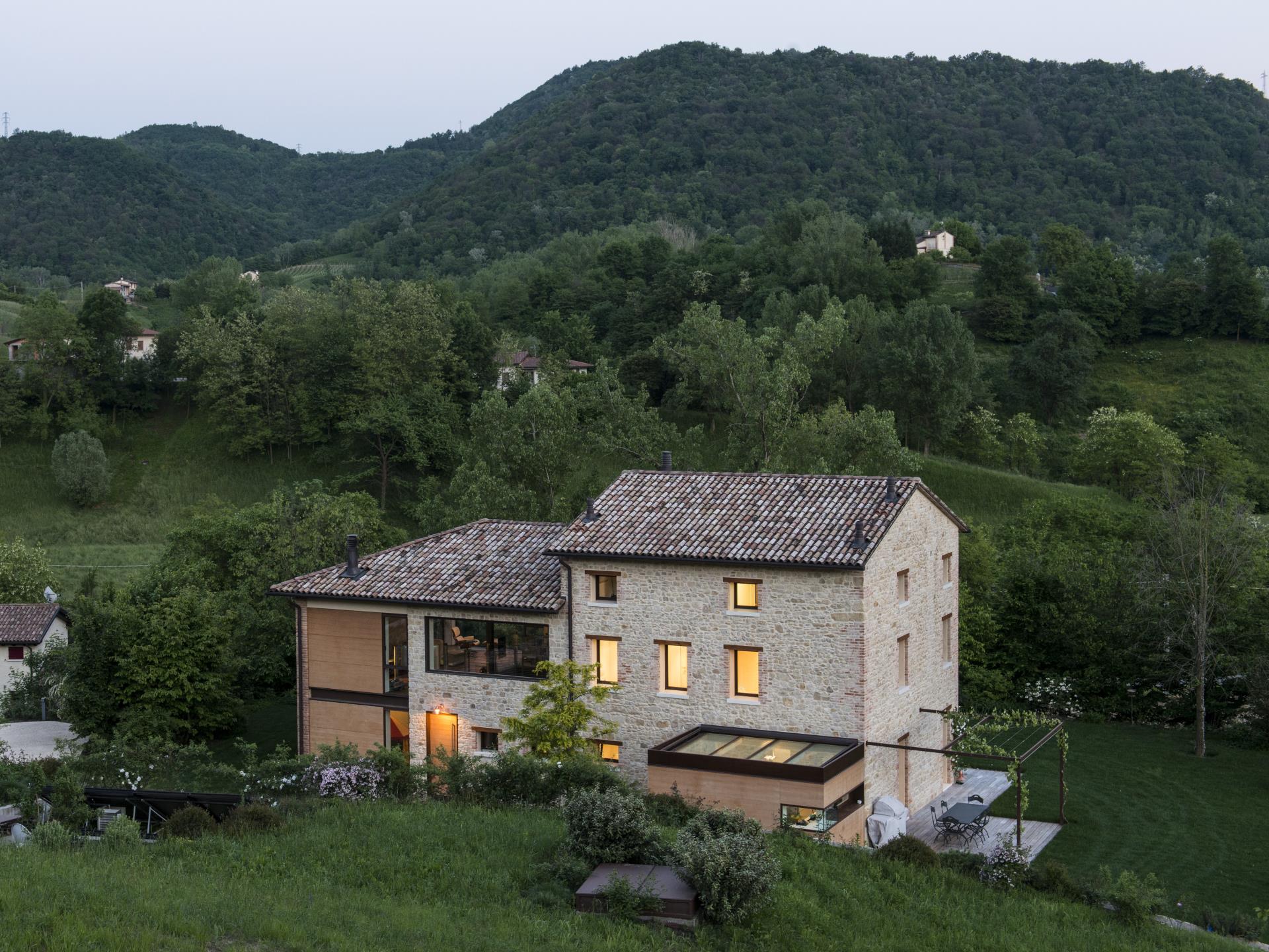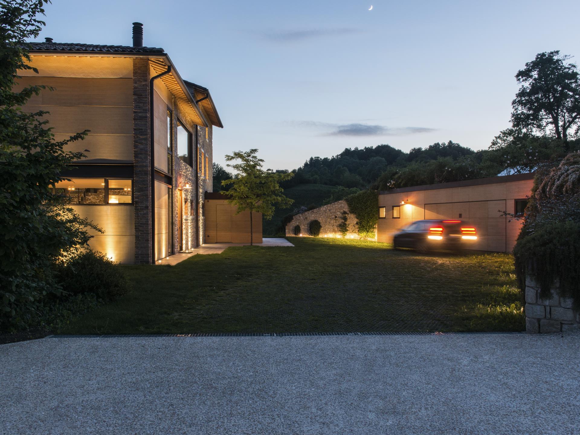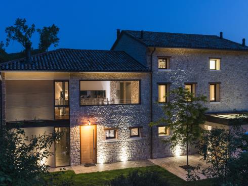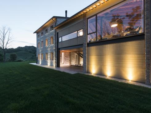 La realizzazione qui illustrata mostra come un intervento di recupero e restauro possa trasformare un manu- fatto rurale in stato di cattiva conservazione in un’opera di straordinaria suggestione, estremamente attenta e ricercata nel confort, nel design, nella sicurezza e nel rispetto delle preesistenze e del contesto naturale nel quale è inserita. L’abitazione richiama all’esterno le sue caratteristiche originarie, grazie al mantenimento dei sassi della muratura e all’utilizzo di materiali come l’acciaio e le doghe in legno quale rivestimento degli altri corpi di fabbrica. All’interno però si svela un’assoluta libertà nell’interpretare gli ambienti in chiave contempora- nea ed ogni cosa, dall’organizzazione degli spazi, agli arredi, alle tecnologie con pannelli solari e alla domotica impiegate, fino alla progettazione dei punti luce e dei serramenti, è testimonianza di questo.